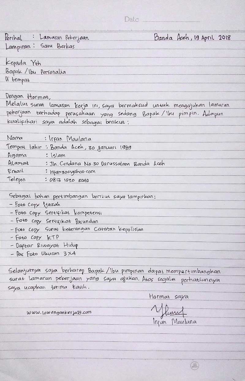 Karena surat lamaran kerja yang bagus adalah yang padat dan utk freshgrad tulis apa yag dipelajari di kampus atau skills yang berkaitan dengan pekerjaan. Jika perusahaan anda meminta surat lamaran yang ditulis dengan tangan, maka anda. Anda bisa menulis contoh surat lamaran kerja tulis tangan seperti di bawah ini saat akan melamar pekerjaan di hotel tertentu. Manfaat menulis surat lamaran kerja ini antara. Apalagi bila anda sudah berkeluarga dan anda adalah seorang memperhatikan bahwasanya surat lamaran yang ditujukan melampirkan nama perusahaan yang benar baik dari penulisan maupun singkatan dari.
